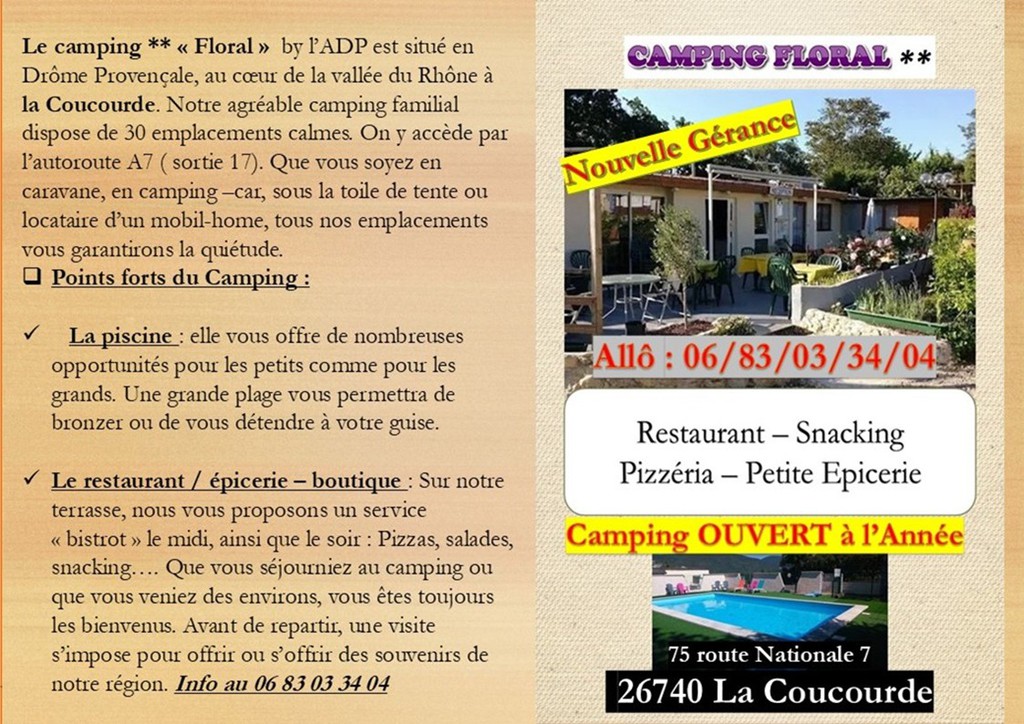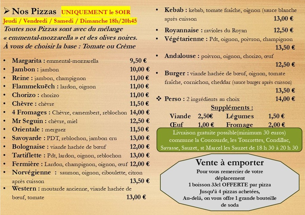 Au camping nous vous proposons : pizzas, Plat du jour " formule Bistrot" (de 11h à 13 h), snacking, un bar avec boisson fraîche et petite épicerie. Possibilité de commander à emporter.